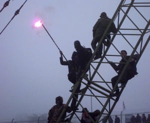 | FacebookTwitterPinterest 1996: Newbury bypass protesters climb on to a crane in the secure area, despite police efforts to stop them. Photograph: PA |